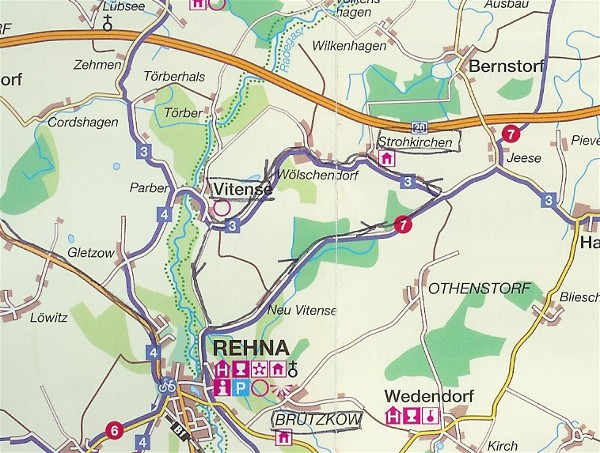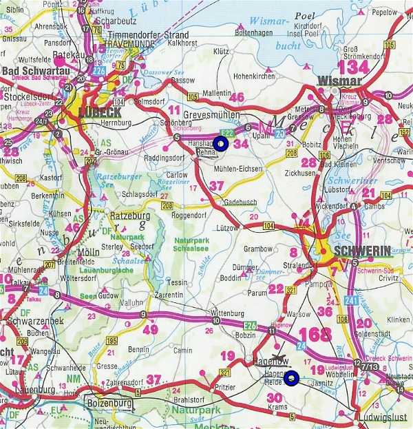 Först en översikt över Mecklenburg. De två blå ringarna markerar var Strohkirchen-byarna ligger. Efter översiktskartan finns detaljkartor över områdena kring byarna. På kartorna finns alla platser som nämns i Toppis och Tores resedagbok utom Testorf och Lüttow. Dessa ligger i närheten av Zarrentin.